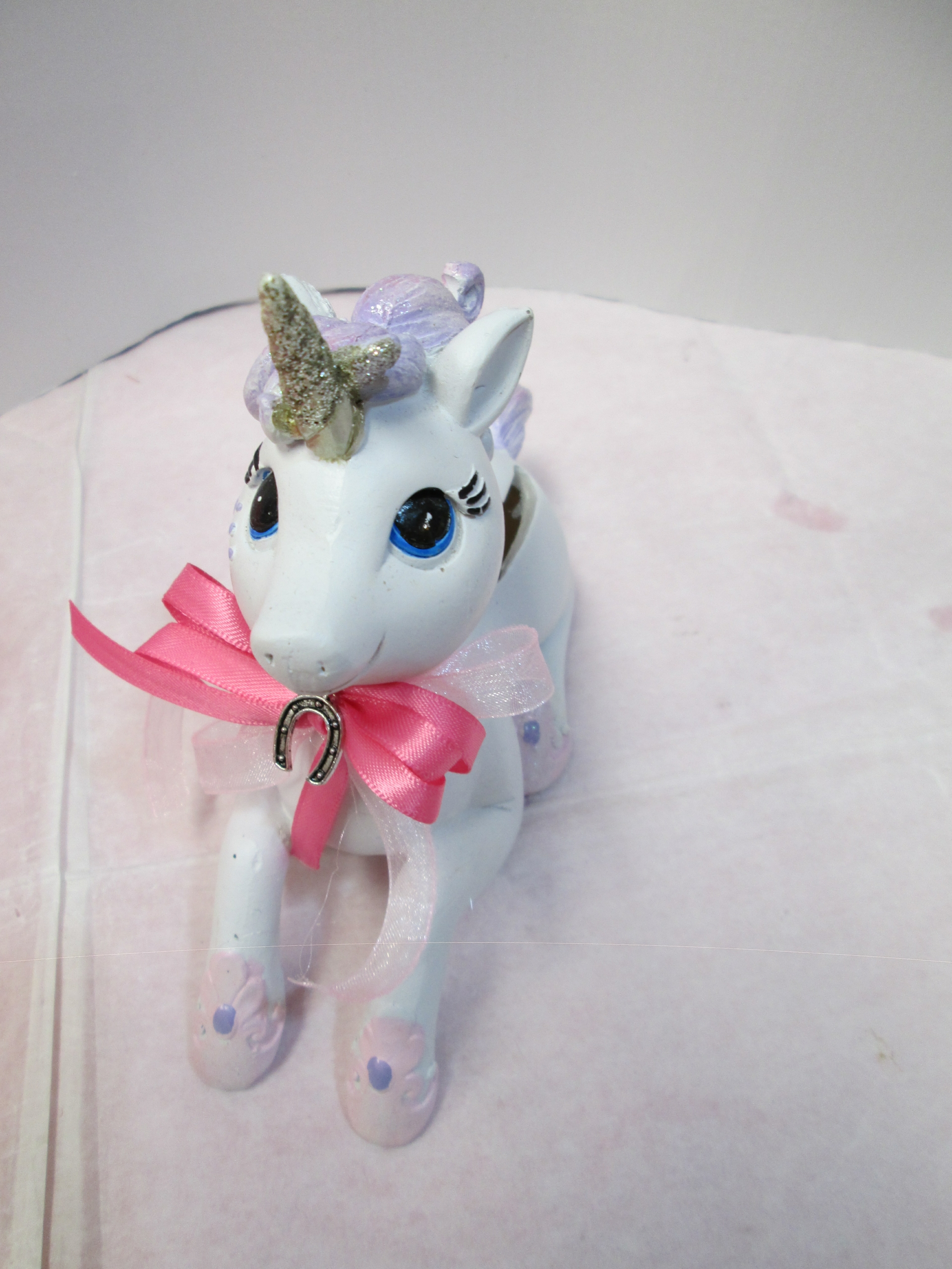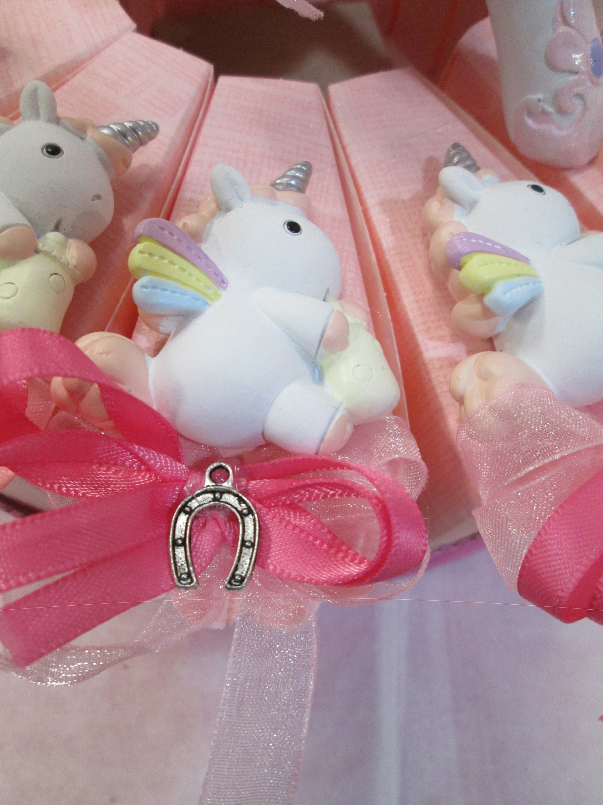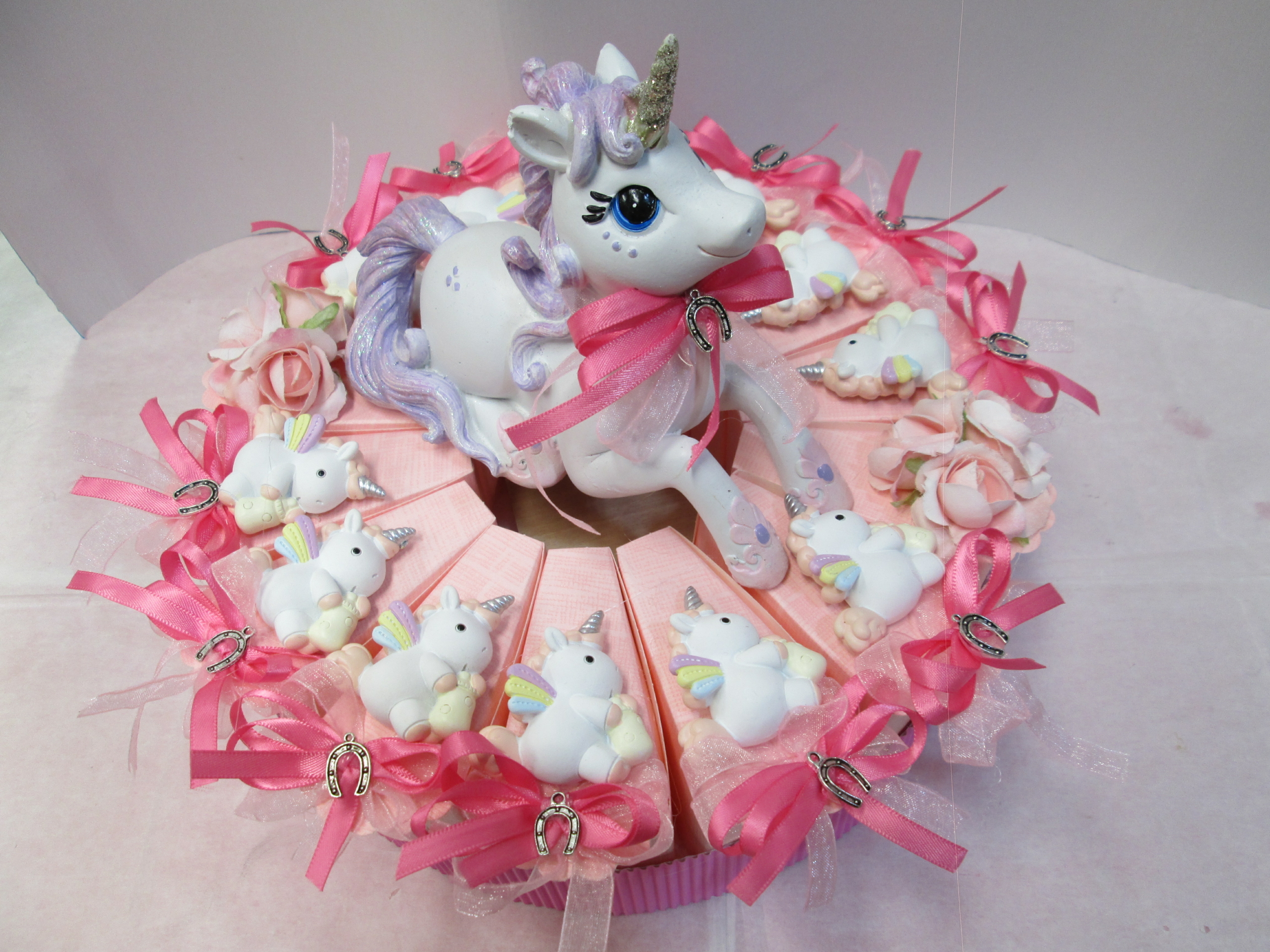 Torta 12 pezzi unicorno calamita h 5 cm, su fetta rosa con all’interno 5 confetti (cioccolato o mandorla) e bigliettino con nome